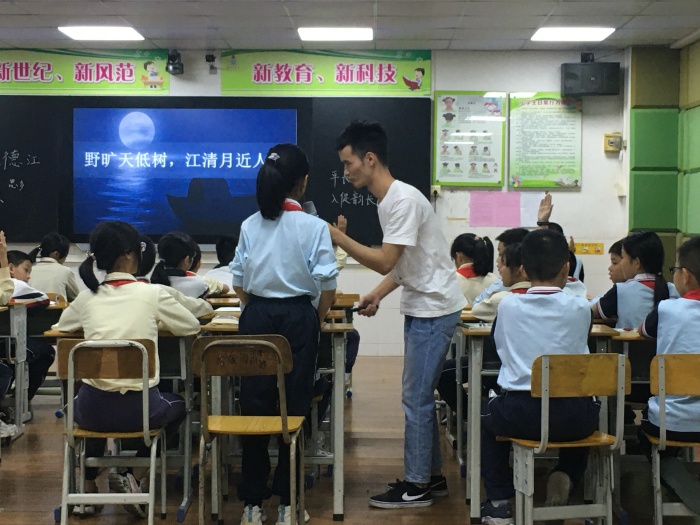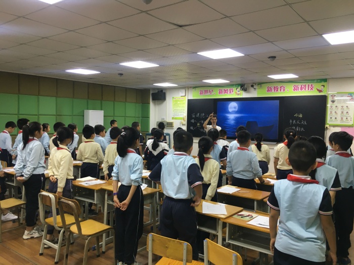 活动伊始,巫勇华老师带领五(2)们的孩子们为大家展示了一节精彩生动的吟诵课例--《宿建德江》。在教学过程中,巫老师先带领同学们理解诗意、想象诗句描绘的画面。在想象中学习吟诵,在吟诵中体会诗人忧愁的情感。为了让学生更好地学会吟诵,巫老师先让学生了解平长仄短、入促韵长的读诵方法,再渐渐引导学生掌握吟诵。在巫老师的启发和引导下,学生在悠扬婉转的吟诵中感悟诗情,以诵促情,且悟且诵。巫老师的经典吟诵课生动、鲜活,在场的师生都被深深地吸引住了。
