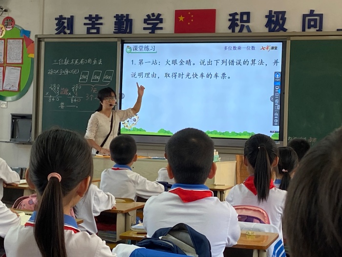 首先,通过复习口算,为学习新知作铺垫。其次,创设情境,探索新知。创设乘法王国认识新朋友的情境,激发学生学习的积极性,在阅读与理解时,罗小静老师重视让学生分析题目,理解题意。紧接着,引导学生通过独立完成,小组讨论竖式计算注意的地方,既培养学生独立思考的能力,同时培养学生小组合作交流的能力,让学生与学生之间产生思维的碰撞。然后,归纳概括,总结提升。通过小组合作,归纳概括三位数末尾有0的乘法计算方法,加深学生对算理的理解,同时培养学生表达概括的能力。最后,学以致用, 巩固深化。通过分层次、多样化的练习,帮助学生巩固本节课的新知。