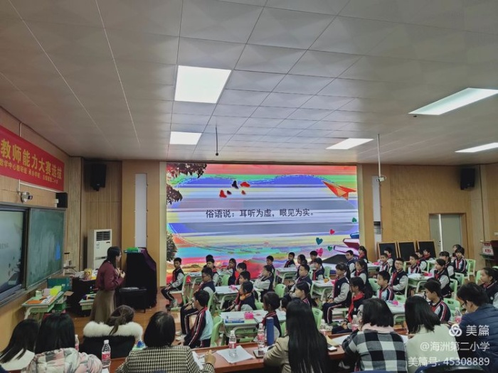 海洲第二小学的袁燕嫦老师参赛的课题是四年级下册的《观察物体》。她结合小组合作的教学模式,引导学生自主学习探索新知,结合视频、实物、教具等让学生直观感受观察物体,深化大教学观小组合作的教育教学改革,在课堂上利用教学艺术,充分调动学生学习积极性,展示了新颖的教学方法。课堂氛围生动活泼,取得良好教学效果。