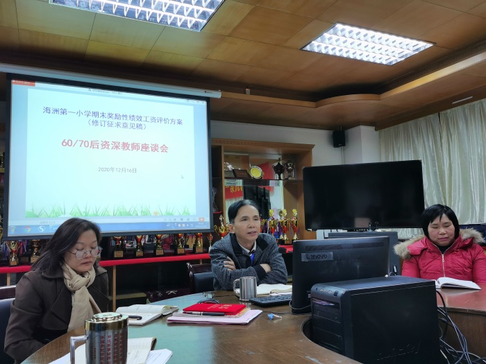 在座谈会前,学校就《中山市海洲第一小学期末奖励性绩效工资评价方案(修订征求意见稿)》向全体教职工进行了意见征询。在征求意见的过程中,学校收集了不少颇有建设性的建议。为了统一思想,让老师们轻装上阵,充满教育激情,为海一小学可持续发展作出应有的贡献,学校分别对60/70后、80/90后、临聘教师、各学科、各年级的老师代表及教代会成员进行了5场座谈会。