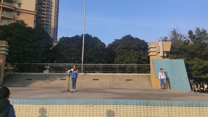 国旗下讲话后,五4班林芷妍同学献上小提琴演奏《我和我的祖国》,表演专业性极强,林同学深情款款的演绎,使全体师生沉浸其中,被深情的艺术魅力所折服,深情的音义加强了同学们对祖国母亲的热爱,使爱国之心春风化雨般洒落在镇南学子的心间。林芷妍同学强调,祖国是和谐的家园,每个人都享受着幸福和温暖。镇南学子要用自己的努力来忠心地热爱她、真情地回报她。要像大雁一样,抱着远大的理想,叼着明珠,飞向远方,为实现中华民族的伟大复兴,不断向前。