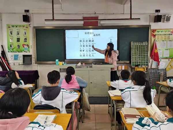 紧接着利用周五午练的时间,王老师在小主人TV室,向全校学生讲解了什么是吟诵,还带同学们认识了基础的吟诵符号。认识古诗文中的平仄,声调的短促与延长。最后各班自由开展了吟诵学习,同学们以《宿建德江》、《夏日绝句》、《游园不值》为例,尽情享受吟诵的魅力,感受吟诵的快乐。