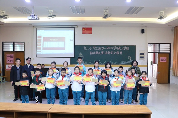 打印 |光阴似箭,时光如梭。转眼间,繁忙紧张的一学期就要悄然离去,孩子们也迎来了期盼已久的寒假生活。2021年1月15日上午,古镇镇古二小学举行了2020学年度上学期结业典礼暨法制安全教育活动,为一个学期的学习生活画上完美的句号。
