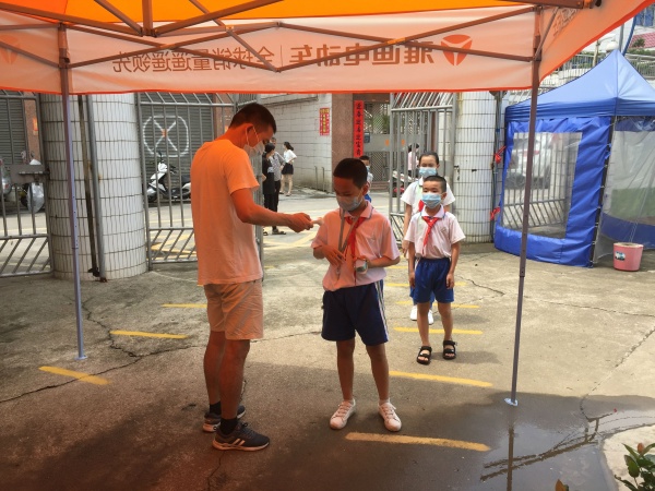 清晨,学校行政跟值日老师们早早来到了校门口,满怀期待等待着孩子们的归来。全校师生严格遵守疫情防控要求,错时错峰入校,家长志愿者帮忙维持秩序,学生间隔一米排队到达校门口后,值日教师认真引导学生有序经过自动测温仪,随后按照规定路线依次进入班级,严把校园入口关。各班班主任在班级门口等待学生,为学生进行手部杀菌,登记体温,细抓班级通行口。整个过程一步不差,规范有序。