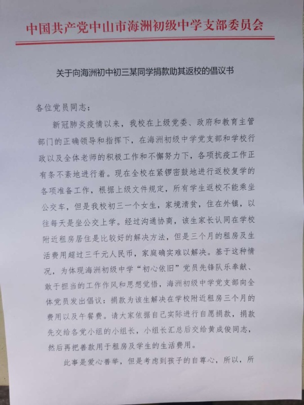 经过向家长沟通协商,家校双方都认同:在学校旁边租一间房子,由学生家长陪同,让孩子就近学习,专心备考,共同度过这3个月的中考冲刺阶段是最佳方案!但是,考虑到这几个月的房租费和生活费对于这样一个家庭来讲,也是难以负担的。在做好疫情防控的同时,让全体毕业班学生返校复学,是命令,是号召,更是责任。为了保证每个学生都能正常复学,为了保证学生一个都不能掉队,在党支部支部书记李天虎同志带头捐款并发出倡议,海洲初级中学党支部全体党员立即响应并解囊为该生进行捐款,为这个孩子能安心返校及中考冲刺助一臂之力!仅两天时间,该党支部就筹得善款3780元人民币。