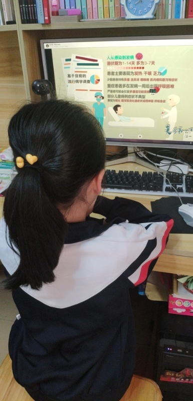 此次主题班会,学生统一在线上观看《复学第一课》视频,视频引导学生进一步了解新型冠状病毒的特点、来源、传播途径以及生活中如何防疫的知识;同时,针对上学前、校园内、放学后等不同时段,对学生进行疫情防控基本知识教育,提升学生疫情防控意识,增强自我防护能力。今年4月份全国卫生月的主题是“防疫有我,爱卫同行”,老师们利用本次主题班会课,倡导学生积极参与爱国卫生运动。还播放了李兰娟院士和钟南山院士对学校复学的开学寄语,激荡起同学们心中的爱国之情、报国之志,认识到肩上的时代使命和责任担当。