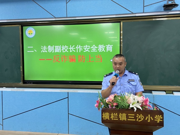 典礼上,三沙小学的法制副校长从“交通安全”、“防火安全”、“防溺水安全”、“网络安全”、“毒品安全”等方面对全体师生进行假期的安全教育,提醒同学们在假期要提高安全法制意识,提高明辨是非、远离犯罪、自我防范的能力,要求同学们以法律来规范自己的思想,用规则来约束自己的行为,做一个遵纪守法的好孩子,过一个平安快乐的假期。