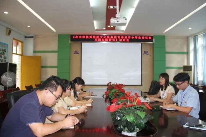 活动伊始,课题主持人欧慧芳校长首先小结了上阶段的研究工作情况,肯定了老师们所作的努力和取得的成果。接着,欧慧芳对近期研究工作进行了布置,要求老师们要认真研读前阶段的研究成果——校本教材《国学采薇》,在研究中立足校本教材,结合学生实际开展各项研究活动。同时,要求老师们要敢于发现,善于积累,把研究成果上升为理论水平,撰写出高质量的研究论文。随后,副校长卢福棠就校本课程的使用提出了指导意见。老师们还围绕如何开展好专题活动的问题展开了热烈讨论。大家各抒己见后一致认为,责任担当教育不仅要在学校开展,还就扩展到家庭,扩展到社会,让学生成长为一个真能有责任担当的人。