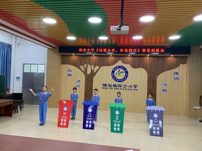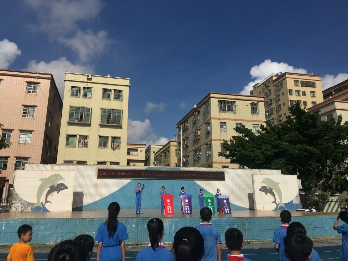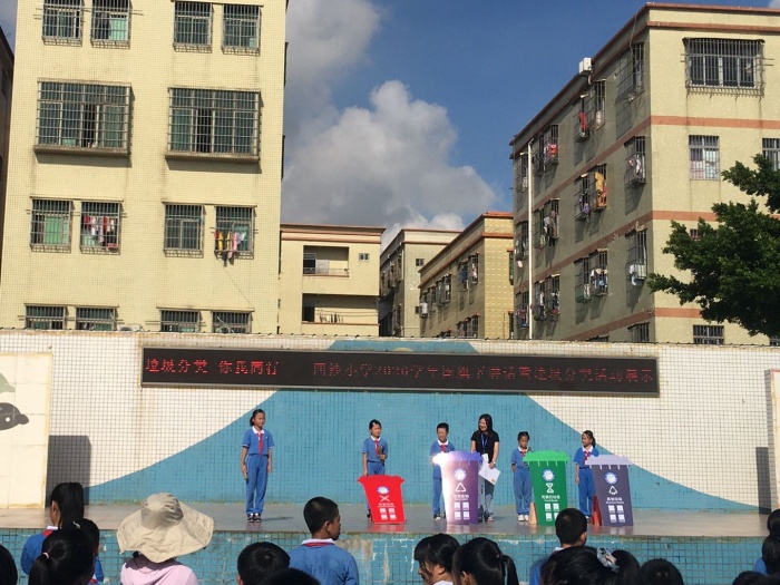 垃圾分类工作是创建文明城市的重要一环。为努力推进四沙小学垃圾分类工作,树立绿色低碳、环保的生活理念,美化居住环境,减少污染,变废为宝,9月30日上午,四沙小学利用大课间时间,全体师生一同集中田径场观看《垃圾分类,你我同行》情景剧。