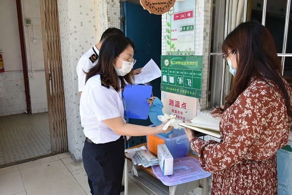 在第二小学全体行政人员的陪同下,验收小组一行先后实地查验了学校体温监测点、教室、饭堂、留校观察室、隔离室、物资库等地,并与学校行政人员就开学期间学生晨检、午检、饭堂就餐秩序及就餐方式、卫生防疫消毒、学生应急处理办法、防疫防控物资准备、校园封闭管理等情况进行了详细了解。