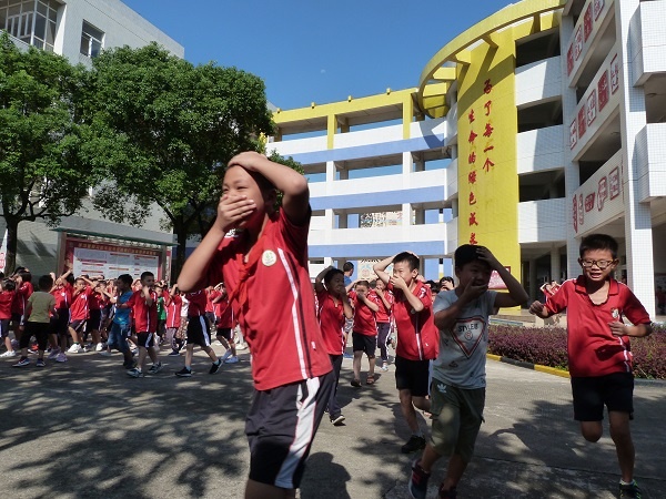 上午第一节课后,随着校园内警报声的响起,楼道值班老师立即到达指定岗位,进行安全疏散管理工作。各班任课教师迅速打开教室的前后门,带领学生弯腰、俯身、捂口鼻,先在课桌下进行躲避演练。当一声“撤离!”令下,各班立即有序地排成两列纵队,用手等捂住口鼻,沿着学校指定楼梯口快速而整齐地撤离教学楼到达操场的安全地带。在确认没有遗留学生后,分布在各楼层的老师也迅速撤离,各班清点人数并汇报。