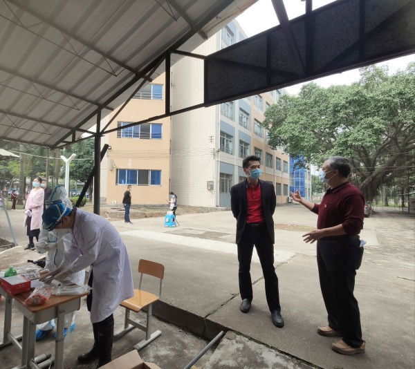 为认真贯彻落实省教育厅关于初中高中毕业年级返校复课的决策部署,迎接即将到来的开学复课,做好校园防疫工作,4月25日,南头镇初级中学在卢新泉校长的带领下,开展南头镇初级中学初三级学生及外镇就读毕业生的核酸检测工作,镇党委薛焯明、镇文体教育局吴永高局长一行莅临学校指导工作。