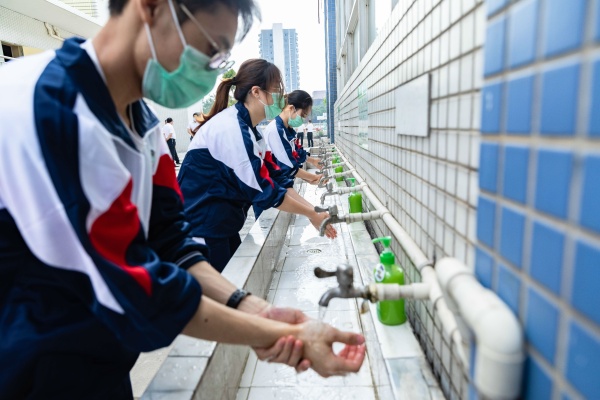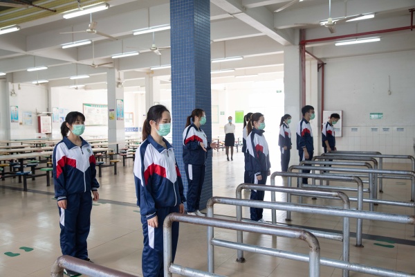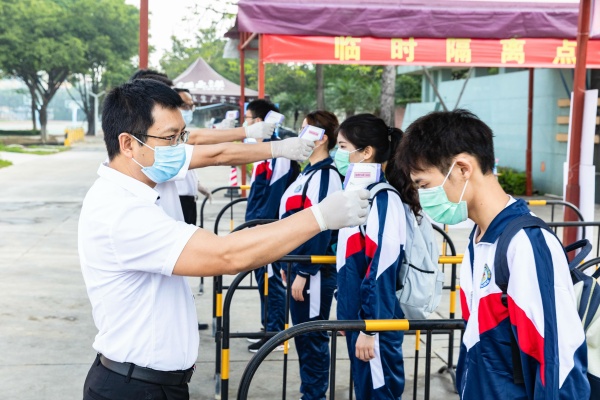 学校大门是校园疫情防控的第一道防线,故演练拍摄首先从学生进入校门开始。校门口拍摄包含了三个场景,一是学生戴口罩,按要求进行排队,由教师测量体温。二是有学生出现体温异常,送至隔离区,由校医进行复检。三是学校老师或外来人员进入学校前进行粤康码的扫描。为了呈现良好效果,需要不断重复,但是,“学生”毫无怨言,只希望能为顺利复学尽自己一份力。