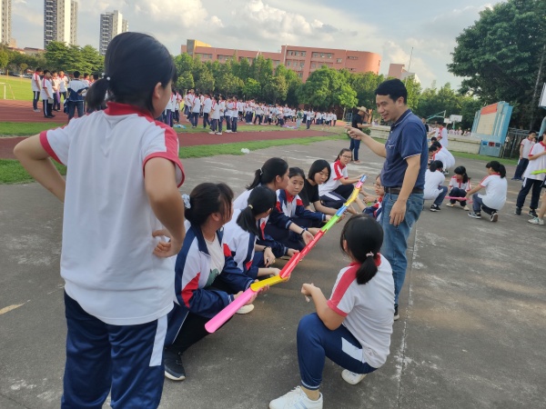 首先,初三年级的学生们在班主任的带领下,怀揣期待与热情,从教室下到操场,在跟班老师和班干部的协助下,以班级为单位分四组开展“珠行万里”、“夹板接力赛”活动项目。活动由此拉开了序幕,妙趣横生的比赛环节营造了轻松愉快的氛围,也让学生们缓解紧张情绪,尽情地投入到活动中来。