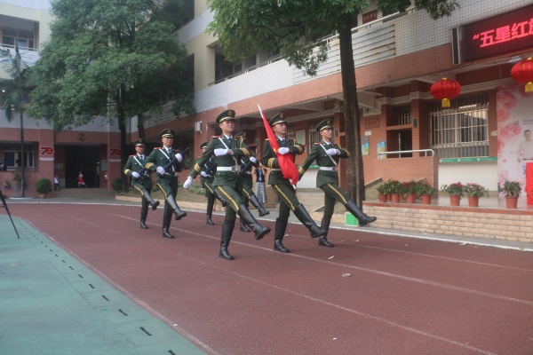 为热烈庆祝中华人民共和国成立70周年,进一步激发广大师生的爱国热情,培养青少年尊重国旗、爱护国旗的情感,9月27日,黄圃镇对甫小学在黄圃优品教育协助下,邀请原武警北京总队天安门国旗护卫队退役军人举行升旗仪式。