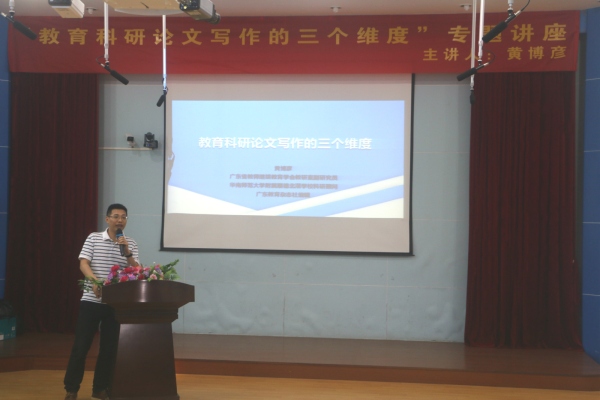 为更好地总结教育教学研究成果,提高一线教师的科研能力,2019年4月29日,由对甫小学主办的“教育科研论文写作的三个维度”专题讲座在五楼录播室举行。本次讲座有幸邀请到了广东省教师继续教育学会教研室副研究员、华南师范大学附属顺德北滘学校科研顾问 、广东教育杂志社编辑黄博彦老师为主讲人。对甫小学中青年教师、黄圃镇学校部分青年教师参加了本次讲座。
