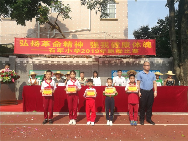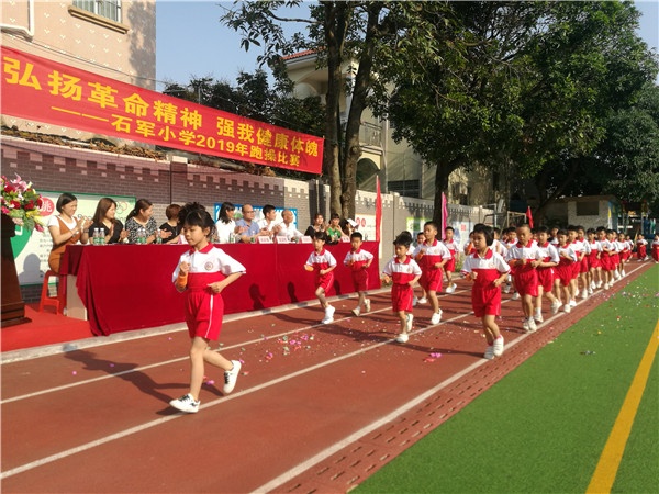 为激发学生运动兴趣,促进学生健康成长,从而树立学生团结合作、竞争图强的意识,并弘扬革命老区不怕苦、不怕累,坚韧拼搏的精神。2019年4月23日,黄圃镇石军小学隆重举办了一次以“弘扬革命精神,强我健康体魄”为主题的跑操比赛活动。