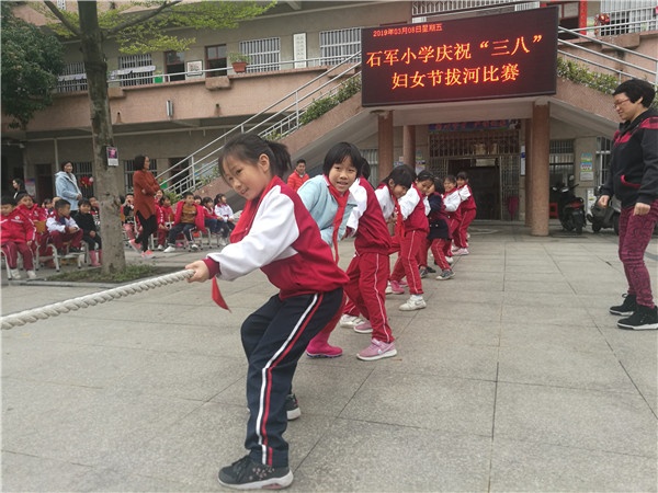 众所周知,每年的三月八日是国际劳动妇女节,是世界各国妇女争取和平、平等、发展的节日,是很具有纪念意义的日子。2019年3月8日,本是阴雨绵绵,却天公做美,天气转晴,黄圃镇石军小学以拔河的形式开展庆祝“三月八”妇女节的活动。