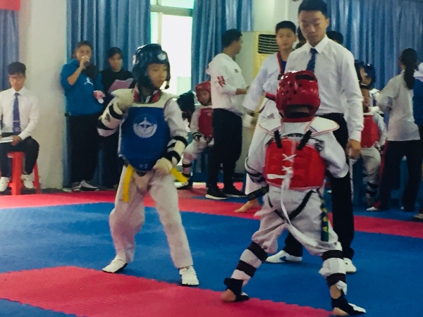 开赛后,运动员们全身披甲穿戴好护具,精神抖擞地走上赛场,裁判员一声令下,双方互相用脚奋力攻击、闪躲、反击,运动员们反应迅速、动作敏捷。而在品势赛上,运动员一招一式劲道有力,幼儿组赛的小朋友们表现得也是有模有样。场上,队员们激烈拼搏。场下,观众们也不示弱纷纷为队员们呐喊助威,呐喊声震耳欲聋,欢呼声此起彼伏……。