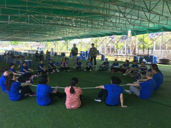 在专业拓展培训师的带领下,全体教师来到绿茵拓展区,开展丰富有趣的拓展活动。首先,进行的项目是“动力绳圈”。在拓展培训师指导下,所有教师站在粗绳圈外,拉着绳子向外微仰成一圆圈,用力绷紧绳圈,然后让一名教师在绳圈上走一圈。这个项目要求每一位拉绳圈的用力均衡,而行走的教师则需要拥有一定的平衡能力。幸而,在太平教师彼此的默契、凝聚力下,轻松完成挑战。