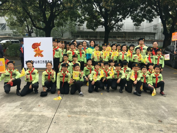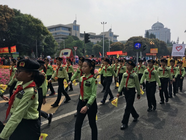 仙小少年军校领袖团代表中山市少先队工作委员会及中山市少先队特色社团参加团市委游行方队,他们身穿训练服,精神抖擞、意气风发,大步走在大道上,不时高喊习总书记对全国少先队员的寄语“从小学习做人,从小学习立志,从小学习创造”,受到了围观群众的热烈喝彩。