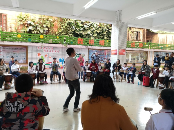 鼓圈音乐治疗,学校安排家长、教师及学生40多人参与音乐治疗团体体验活动,通过音乐治疗,促进人际关系的良性互动,从而促进人们的身心健康。