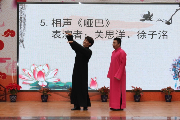 紧接着,中山市文学艺术界联合会和中山市戏剧家协会带来了原创戏剧曲艺作品巡演。《我是歌王》、《掉的就是这个孩》、《哑巴》等5个相声,引得全校师生捧腹大笑、连连喝彩。