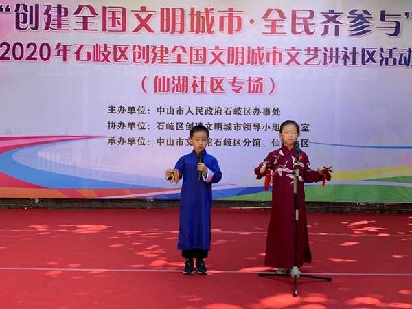 为了助推中山市创建全国文明城市的建设工作,提高群众对创文的知晓率,让创文工作深入人心,引导广大人民群众当好创文活动的宣传者、参与者,由中山市人民政府石岐区办事处主办、石岐区创建文明城市领导小组办公室协办、中山市文化馆石岐区分馆、仙湖社区承办的“创建全国文明城市?全民齐参与”文艺进社区活动于2020年7月23日上午9:00-11:30在仙湖正街的健身公园成功举办,石岐高家基小学积极参与此次文艺进社区活动,为附近居民群众献上精彩的文艺演出。