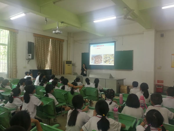 此次活动由广东新导传媒有限公是的李清春老师以《夏季食品安全风险》为主题进行大讲堂活动。主要讲授食品安全的概念;夏季食品安全知识;食物中毒;外出就餐如何吃得干净卫生;预防食物中毒的方法等五个方面进行介绍,同时还提醒学生路边摊食品、“五毛”辣条的危害,呼吁大家不购买不食用那些对身体健康有害的食品。现场设置宣传咨询摊位,为答对的小朋友派发小礼品。
