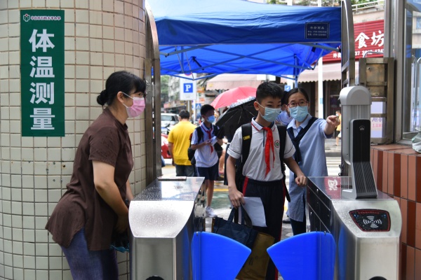 早上7:15分,学校行政、值日老师、家长护卫队及莲峰派出所警察叔叔们,早早地在校门口热切地等候着返校的师生们。7:20分开始,学生有序地按学校错峰安排陆续返校,尽管隔着口罩,也能感受到同学们按奈不住的喜悦之情。在老师的引导下,同学们以1米间距排队,依次检查复学码和承诺书,通过体温检测等防疫步骤后才进入校园,把好入校安全第一关。四至六年级273名学生,全都顺利返校。
