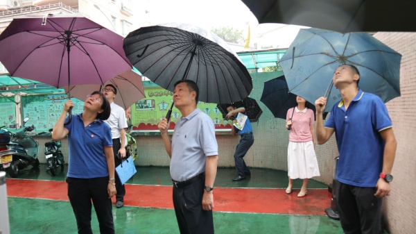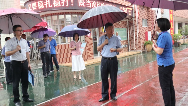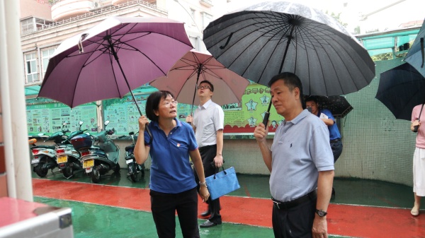 一大早,大雨如注,黄桂光书记一行冒雨来到了太平小学,进行调研指导工作。黄桂光书记来到学校,首先认真地听取了郑结霞校长关于开学工作汇报,然后详细了解了学校的办学规模、设施设备、师生到校及学校存在的困难等情况,他特别询问学校还有哪些方面需要区政府帮忙解决的问题。郑结霞校长表示对黄桂光书记对学校教育工作的关心表示衷心的感谢。她说,学校的一切教育教学工作都在有序的开展,老师和孩子们个个精神焕发,学校设施设备一切正常运行,欢迎黄桂光书记有空常到学校来调研,多多指导学校的教育发展工作。当黄桂光书记了解到学校的校舍是多年前在市、区政府的“穿衣戴帽”工程中加固翻新之后换的新颜时,对学校建筑的安全问题也进行了详细的了解。他称赞太平小学虽然建筑面积小,但校园环境优美,管理有序,是学生学习的好地方。