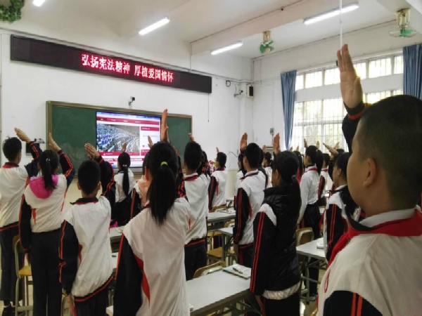 据了解,学校为师生们营造了一个浓厚的宪法学习氛围,在宣传栏海报上、电子屏幕上处处刊播着宪法宣传标语,孩子们利用课间不时驻足学习;课后,全校每个学生还同家长一起,进行了“学宪法讲宪法”网上学习和“宪法小卫士”活动,实现了学习教育活动的广参与、全覆盖、实效性。