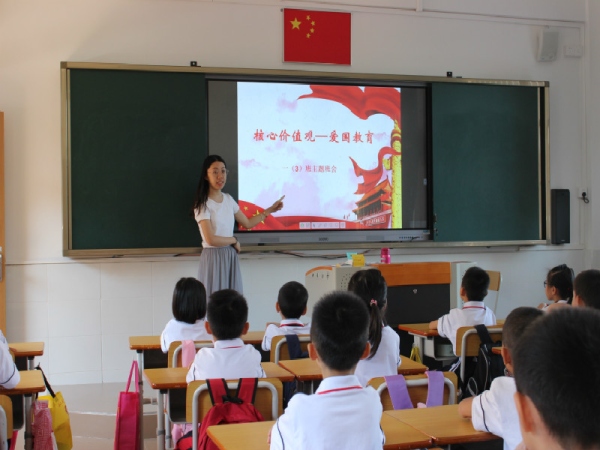 升旗仪式结束后,各班孩子在班主任的组织带领下,在课室继续进行《我和我的祖国》主题班会课。有的班级举办“迎国庆朗诵会”,抒发了他们对祖国的赞美之情,树立了报效祖国的崇高志向;有的班级开展“祖国知识竞答”活动,寓学于乐,让学生在趣味竞答中更了解了祖国,从而加深了对祖国的认识与热爱;有的高年级班会由学生主持,同学们结合自身实例,表达爱国热情,讲中国故事,夸中国名人,增强了民族自尊心和自豪感。同时,参与活动的教师,身心也受到洗礼。