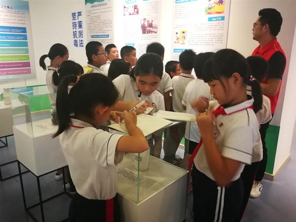 走进心知湾禁毒社工服务中心,禁毒办工作人员首先对石岐区康复工作站的工作内容、开展的相关活动,及工作站“七类四级”管控模式进行了简单的介绍。接着,又带着大家参观了康复工作站的书画室。书画室中,有书画老师、戒毒者,以及慕名前来学习的小朋友们的精美作品;看到这些书画,家长和师生们纷纷赞叹,真没想到在康复工作站居然还有如此高尚雅致之地!紧接着,禁毒办工作人员又带领大家参观了中山市石岐区毒品教育基地。在教育基地中,禁毒办工作人员对新型毒品种类、特点、危害进行了详细的讲解,同学们边听边认真地做着笔记。同学们通过对毒品的近距离观察,不时发出一声声惊叹。当大家走进中山禁毒时光屋,看到各种自己爱吃的跳跳糖、棒棒糖、咖啡等成了毒品,一个个都很吃惊,表示以后不敢再吃这些东西了。禁毒专干告诉他们,这些并不是他们爱吃的东西,而是不法分子把新型毒品进行改装,引诱他们吸毒,所以以后要加强警惕,陌生人给的食物不要随便接受,以免上当。