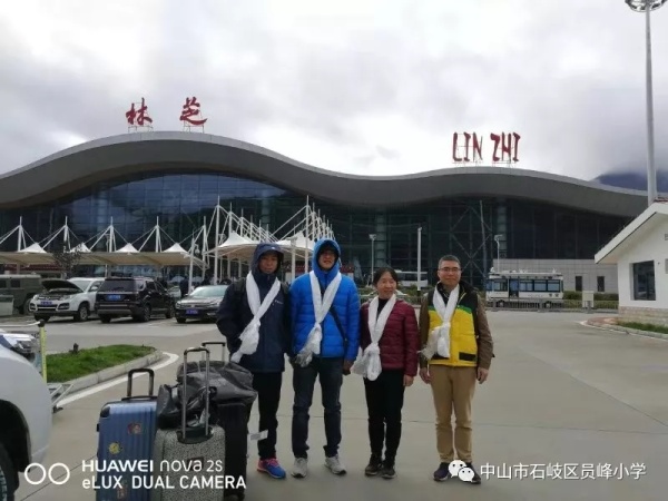 10月8日凌晨两点,帮扶小组一行四人从中山出发到广州白云机场,搭乘6:00的班机飞往林芝。9:50分,班机准时抵达林芝机场。西藏工布江达县错高乡中心小学德玛校长非常热情,特地驱车数百公里来林芝机场接机。德玛校长为四位老师献上了洁白的哈达,藏族同胞的热情好客感染着初上高原的中山老师们。