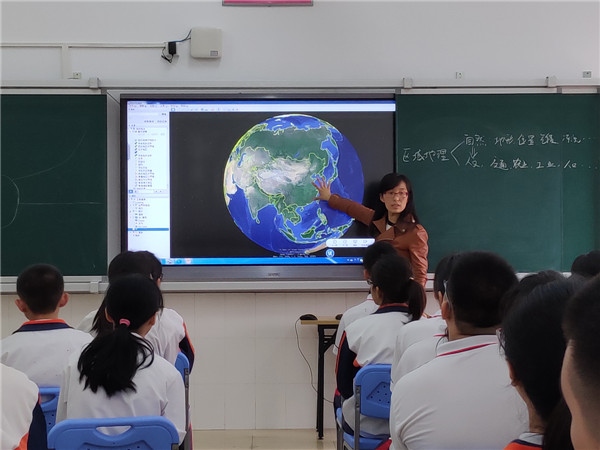 说课活动之后,北区中学勾青梅老师在智慧课室给初二学生上了一节《中国的区域差异——人文差异》的公开示范课。勾青梅老师作为市级地理课题《Google earth在初中地理教学中的应用》的成员,在示范课例中大量应用Google earth 软件,绘制多边形展示了四大区域轮廓,发挥了Google earth的地理模型功能,利用缩小和放大功能展示了青藏地区的河谷农业,大大激起了学生的学习兴趣,利用Google earth的地形图展示功能,为学生展示了立体的地图,利于学生的立体思维学习与发展,并在最后利用Google earth浏览功能展示了世界六大湾区在地球上的位置与形象,起到了非常好的教学效果,受到听课老师的一致好评。整节课,重难点突出,应用了大量的智慧课堂技术,将地理学习上升到一个新的高度。