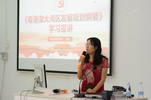 5月23日,北区中学举办培训班,学习贯彻《粤港澳大湾区发展规划纲要》(下称《纲要》)。培训班邀请中山市党代表张馨老师主讲,全体党员教师32人参加。
