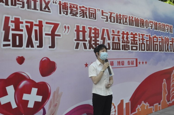 接着体育路学校家长代表吴淑玲女士作了热情洋溢地发言,她表示对学校与凤鸣社区“结对子”共建公益慈善活动表示十分支持和认同,认为此项活动对孩子们来说不仅是一项公益慈善活动,更是一次非常难得的社会实践,能够帮助别人、服务社会,非常有意义!她倡议更多的家长身体力行地带领孩子一起参与“结对子”慈善活动,同时祝愿此次活动让孩子们都能学有所思、学有所长!