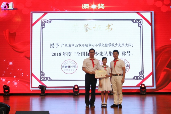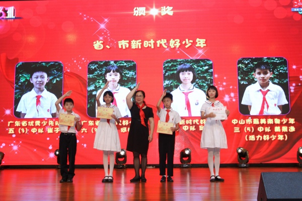 紧接着,孙慧涛主任主持了表彰大会。首先,团市委学校部部长罗必立先生向学校颁发了“全国优秀少先队集体”奖状,然后是梁校长为崔子傲(广东省优秀少先队员)、何梓瑜(广东省新时代好少年)、黄景逸(中山市最美南粤少年)、邱丹蕴(中山市新时代好少年)等四位队员颁发了相应奖状;冯冠祥副校长、蔡洁珊女士为黎桂芳等17位荣获校“优秀辅导员”称号的教师颁发了奖状,表彰她们在过去的一年中带领着各自中队脚踏实地,勇创佳绩。梁钟添副校长、杜少君副校长为六(1)中队等18个荣获校“红旗中队”称号的中队颁奖;罗必立部长、梁校长、冯校长、蔡洁珊女士为全校48个中队的优秀客座教师、好家长代表颁奖,石丽文主任、崔士强副主任、于海洋副主任、谭志凌副主任为校新时代好少年和其他奖项代表颁奖。在场的老师、同学和家长们对获奖教师和同学们报以长时间的热烈掌声,表达着祝贺,也表达着向榜样学习的决心。
