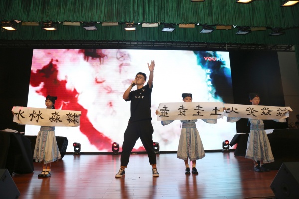 颁奖结束后,田中阳老师随着音乐的响起,从体育馆最后一排边走边唱起了网红歌曲《生僻字》,并与学生及家长挥手致意,动感的旋律瞬间燃爆全场!学生、家长、老师们在这热烈的气氛中,感受着“六一”快乐。舞台上四位同学挥豪泼墨,一曲终了,同学们笔下的几个生僻字的书法作品也展现在舞台上:火炎焱燚、水沝淼?……