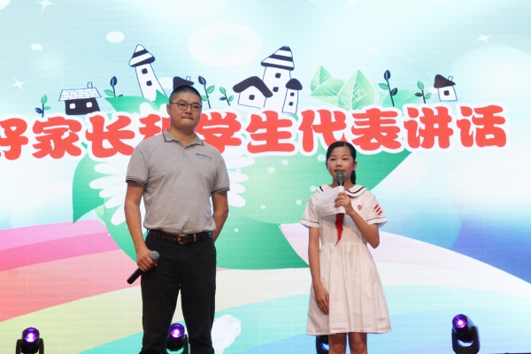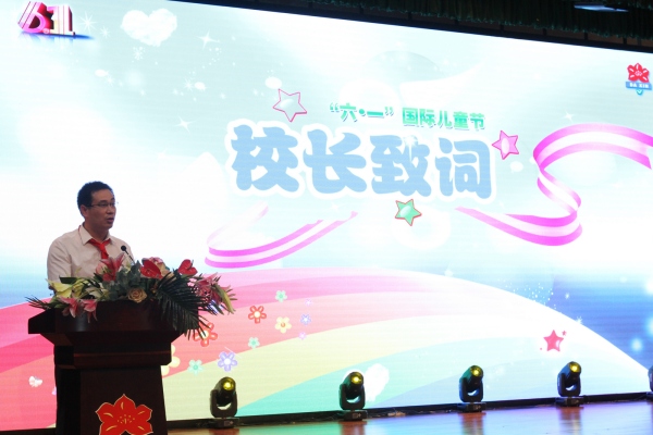 在谢华老师的指挥下,活动在《红领巾飘起来》的歌声中拉开了的序幕。严谨规范的大队会仪式后,石岐中心小学大信学校冯冠祥副校长发表了亲切的“六·一”儿童节致词。冯校长对领导、嘉宾和家长们的到来表示了热烈地欢迎,对全体少先队员们致以节日的问候和祝福。冯校长肯定了各学科的主题活动周,以及各社团和各比赛团队的成绩,对老师们兢兢业业、恪尽职守的工作进行了大力表扬,然后介绍了学校取得的一些荣誉,如:全国优秀少先队集体、全国校园足球特色学校、广东省少先队红旗大队、广东省健美操啦啦操比赛(中山站)第一名、广东省第九届小小科学家少年儿童科学教育体验活动优秀组织奖、广东省第九届小小科学家少年儿童科学教育体验活动实验学校、广东省定向锦标赛第四名等,还介绍了近期师生获得的省、市级奖项……最后冯校长祝福少先队员们做小小追梦人,每天都如鲜花般灿烂!随后,六(6)郭文月和她的爸爸作为学生代表和家长代表发言。文月爸爸和文月对大信学校的培养表达了深深的感谢,并祝福大信学校生机勃勃、木棉绽放!