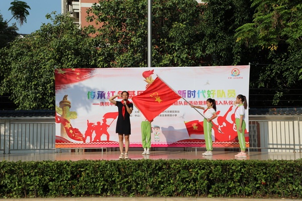 嘹亮的中国少年先锋队队歌响起,护旗手们迈着矫健的步伐,精神抖擞地高举队旗从整齐的队伍前走过。出队旗仪式后,全体队员高唱队歌。接着,香晖园小学少先队大队长王敏乔宣读大队委决议,宣读新队员名单。在激昂的音乐声中,四年级队员代表为新队员佩戴红领巾,并相互敬礼,全体新队员在大队长的带领下举起右拳大声宣誓。随后,香晖园小学副校长陈肖影为各中队授队旗,并发表讲话。陈副校长首先对新入队的孩子们表示祝贺,并鼓励孩子们要在星星火炬的指引下,以严格的标准规范自己的行为,怀着一颗火热的心,认真学习,礼貌待人,养成良好的学习和生活习惯,茁壮成长,争做优秀的队员。在大队辅导员杜沁源老师的带领下,少先队员们大声呼号“时刻准备着”。