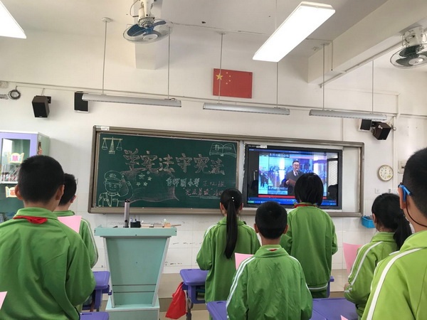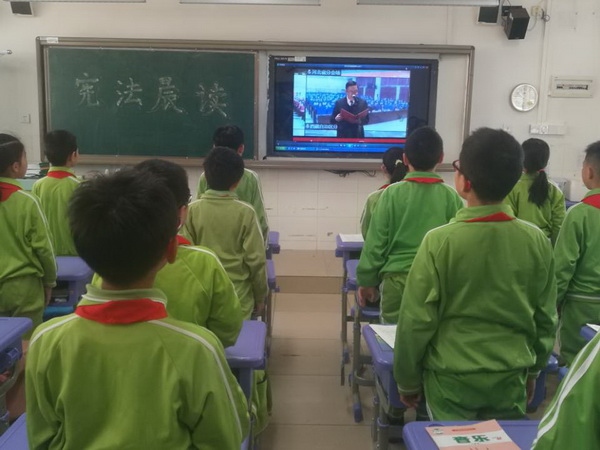 宪法日当天早上,学校组织各班级开展了“读宪法、学宪法、懂宪法、争做守法小公民”主题学习活动。全体学生在老师的带领下观看教育部在北京举办的“宪法晨读”活动,并学习了《中华人民共和国宪法》第一条、第二条、第五条……第四十六条、第五十四条等重要内容。在各班主任老师的领诵下,伴随着朗朗的诵读声,师生们深深地感受到宪法作为国家根本大法的神圣不可侵犯性。