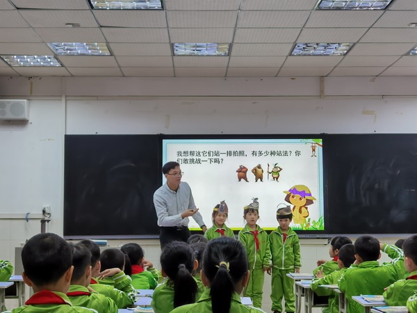 陈浩亮老师的数学课《搭配》,课堂活动多样化,手段灵活。他让同学们在观察、猜测、动手操作的活动中,找出最简单的事物排列规律。无论是数字王国闯关,还是给树城堡、花城堡涂色,给熊大、熊二、奇奇拍照,都把数学知识放到活动中教学,充分调动学生积极性。