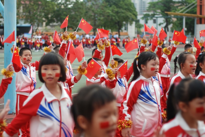 入场式结束,雄壮的国歌声响起,庄严的五星红旗和校旗飘扬在运动场上空。