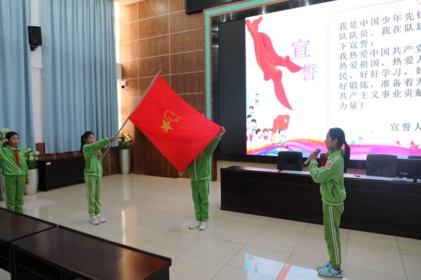 伴随着嘹亮的出队旗曲,旗手和护旗手们迈着整齐、铿锵有力的步伐出场。紧接着,全体队员起立,高唱队歌,新队员们精神饱满,歌声洪亮,唱出了心中的自豪和对少先队组织的无比热爱。少先队大队长王敏乔同学宣读完新队员名单后,六年级优秀少先队员代表为新队员戴上了鲜艳的红领巾。戴上红领巾的新队员们个个精神抖擞,脸上洋溢着幸福和自豪的笑容。在副大队长赵梓默的带领下,新队员们在队旗下庄严宣誓,老队员重温入队誓词。宣誓结束后,少先队总辅导员杜沁源老师讲话,她对新队员们加入少先队组织表示祝贺并提出了殷切的希望,希望新队员们在星星火炬旗帜的指引下,踏着先辈的足迹,以严格的标准规范自己的行为,努力学习,勇敢前进,学会感恩,珍惜生命,牢记自己的光荣使命。最后,全体队员在杜老师的带领下齐声呼号。