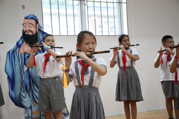 随后,学校竹笛社团为新生和家长们献上热情的《万马奔腾》,五(6)班同学则为学弟学妹们带来经典诵读《千字文》。悠扬热情的笛声、铿锵有力的读书声,声声入耳,博得在座学生和家长阵阵掌声,充分展示了学校“关怀教育”理念下艺术特色教育的成果。六年级6班的张珂同学以大学姐的身份,以学生的视角,声情并茂地从校园环境、学校作息、课程设置、教师特点等全方位、多角度向一年级弟弟妹妹们作了详细介绍,一年级新生们目不转睛,听得津津有味,眼里充满了对新的学习生活的憧憬和期待。