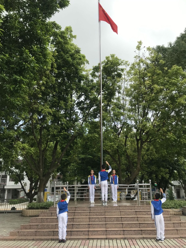 本次升旗仪式由大队长陈欣怡同学主持,在全体师生的注目礼下,当学校鼓号队的出旗曲响起,护旗手踏着整齐划一的步伐,将国旗护送至升旗台,交至升旗手的手中。激昂的《义勇军进行曲》响起,全体注目,少先队员行队礼,用饱满的热情奏唱国歌,五星红旗在空中冉冉升起。