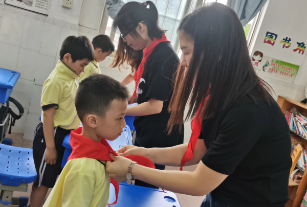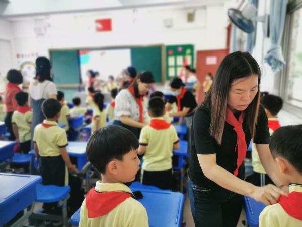 仪式上,一年级全体新队员激情澎湃,齐唱队歌,歌声嘹亮。大队辅导员郑老师宣布加入少先队员名单,老队员为新队员佩戴红领巾。佩戴上鲜艳的红领巾,让每一名少先队员都增添了一份自豪与责任;庄严而隆重的仪式,给每一名新队员心中都留下无比神圣和难忘的记忆,为他们的人生画上浓墨重彩的一笔,也让孩子们对他们胸前的红领巾,多了一份骄傲与敬畏之心。新队员们佩戴好鲜艳的红领巾,在队旗下,郑重地握起右拳,庄严宣誓:时刻准备着为共产主义事业而奋斗!