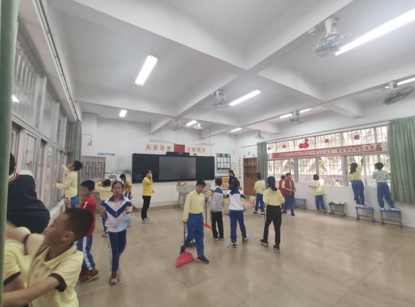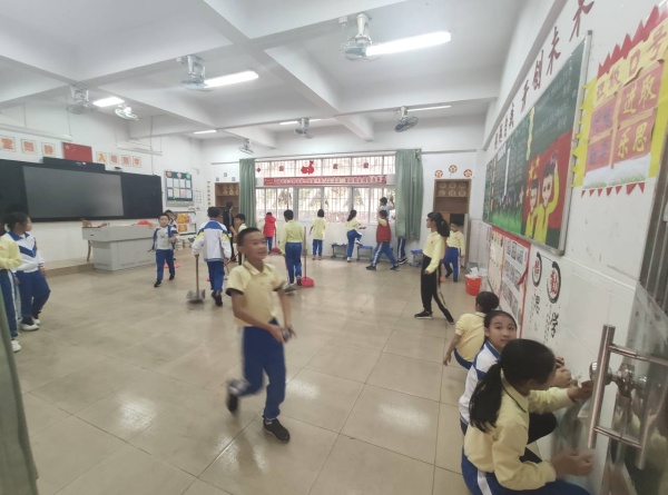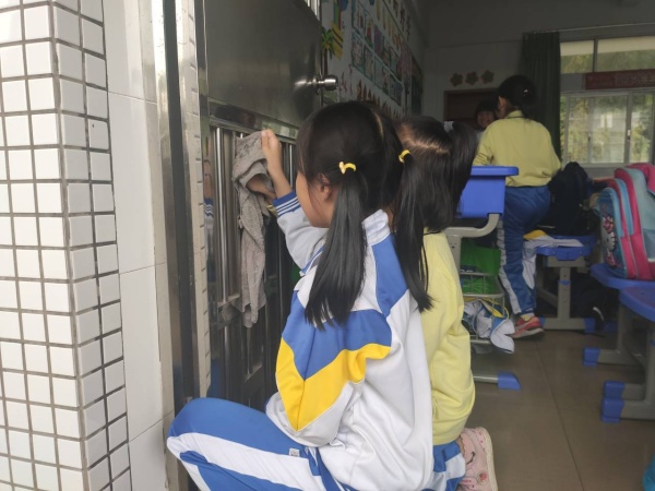 活动中,同学们在老师的指导下,全面打扫教室各个角落,清理地面上的污渍,扫除教室墙面上小纸片和杂物,清除整理图书角、讲台上的粉尘杂物,擦洗黑板、玻璃窗台和墙脚的污渍。校园的每个角落都能看到同学们劳动的身影,到处都是热火朝天的劳动景象。